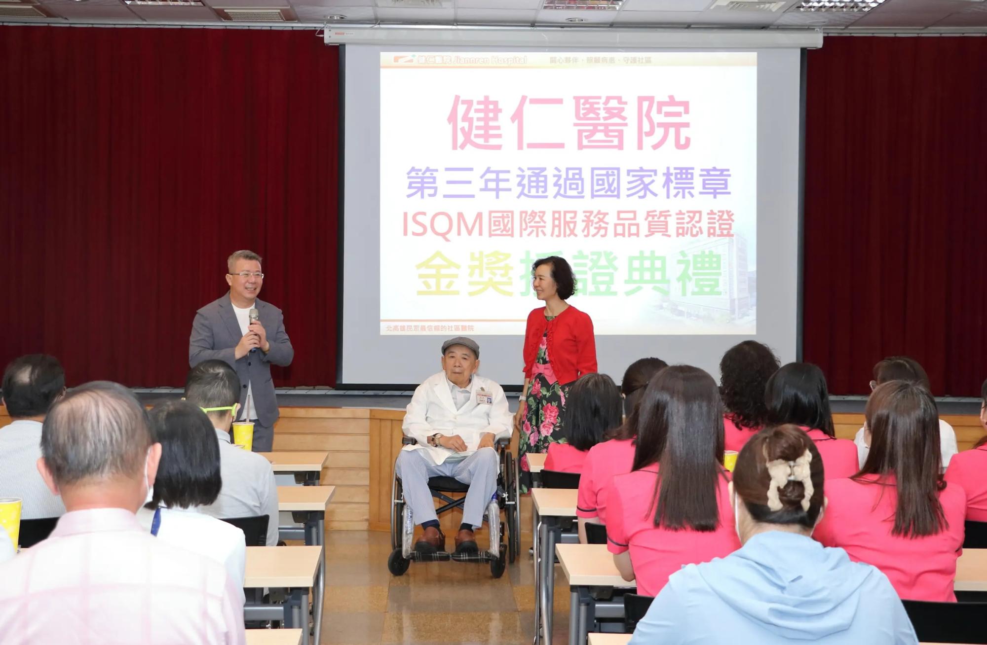 ISQM國際服務品質認證是國家標章,以:溫度、安全、品質、精緻、感動,五大目標嚴謹的檢驗醫院「服務的靈魂」,並採二階段全方位專業審查制度:第一階段:不通知神秘客服務稽核:專業評核人員以一般民眾身分至院內看診,從掛號、候診、檢查到離院,完整觀察各科室服務流程,包括:第一線人員服務應對態度、動線規劃、現場秩序與安全、醫事人員應對與服務溫度,確保院方在未通知審查狀態下,仍能維持一致的醫療服務品質。第二階段:各科室全面實地審查,逐項檢視近90~130多項規範:評核委員以通知方式到醫院各科室審查,內容涵蓋:醫療流程、文書與表單管理、環境整潔與感染控管、消防與安全設備、應變能力、服務應對與風險預防機制,層層把關,確保醫院服務體系的完整性與精緻性,這不只是審查,更像是一場對醫院整體文化與團隊默契的深層閱覽。能在總分90分以上,才得以獲得高門檻金獎的榮耀,這也意味著健仁醫院的整體營運表現,不僅滿足標準,更落實了「讓人感動」的服務價值。