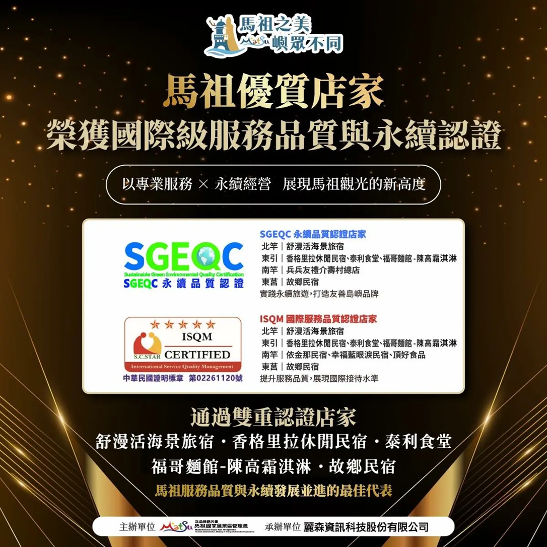此次通過認證名單,SGEQC永續品質認證-銀獎:北竿「舒漫活海景旅宿」、東莒「故鄉民宿」,銅獎:南竿「兵兵友禮」、東引「泰利食堂」、東引「香格里拉休閒民宿」、東引「福哥麵館–陳高霜淇淋」,ISQM國際服務品質認證-銀獎:南竿「幸福藍眼淚民宿」、北竿「舒漫活海景旅宿」、東莒「故鄉民宿」、東引「泰利食堂」、東引「香格里拉休閒民宿」、東引「福哥麵館–陳高霜淇淋」;銅獎:南竿「依金那民宿」、南竿「頂好食品店」,等共九家業者,他們共同證明,卓越感動服務與對永續環境尊重可以完美共存。這份榮耀背後,是專業輔導團隊-麗森資訊與興誠服務品質管理訓練機構的深度投入,從能源盤點、永續環境協助,到創新感動服務流程優化,透過系統化工具,讓業者每一步都走得踏實而堅定,將永續理念與幸福感服務,有明確步驟落實,不再是抽象主觀認知。